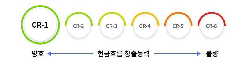 • 현금흐름등급은 CR-1~ CR-6까지부여되며 CR-1의현금지급 능력이가장 양호합니다.
